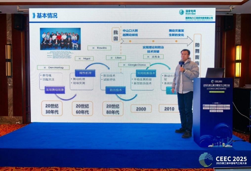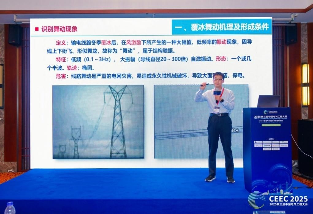 国网电力工程研究院有限公司刘彬教授级高工作了《架空导线覆冰舞动研究进展》报告。报告指出,覆冰导线在风载作用下引发的低频大振幅舞动是威胁电网安全运行的重要致灾因素,其本质为气动负阻尼导致的非线性失稳振动。提出了以“改变气动载荷、覆冰条件与结构参数”为核心的防舞技术体系,研发并应用了扰流防舞器、相间间隔棒、双摆防舞器等多类防舞装置,有效抑制了导线舞动幅度与能量积聚。面对极端气候频发的新常态,研究进一步强调应构建涵盖智能感知、风险评估与综合防护的覆冰舞动韧性提升体系,为电网在复杂气象条件下的防灾设计与运行维护提供了系统性技术支撑。