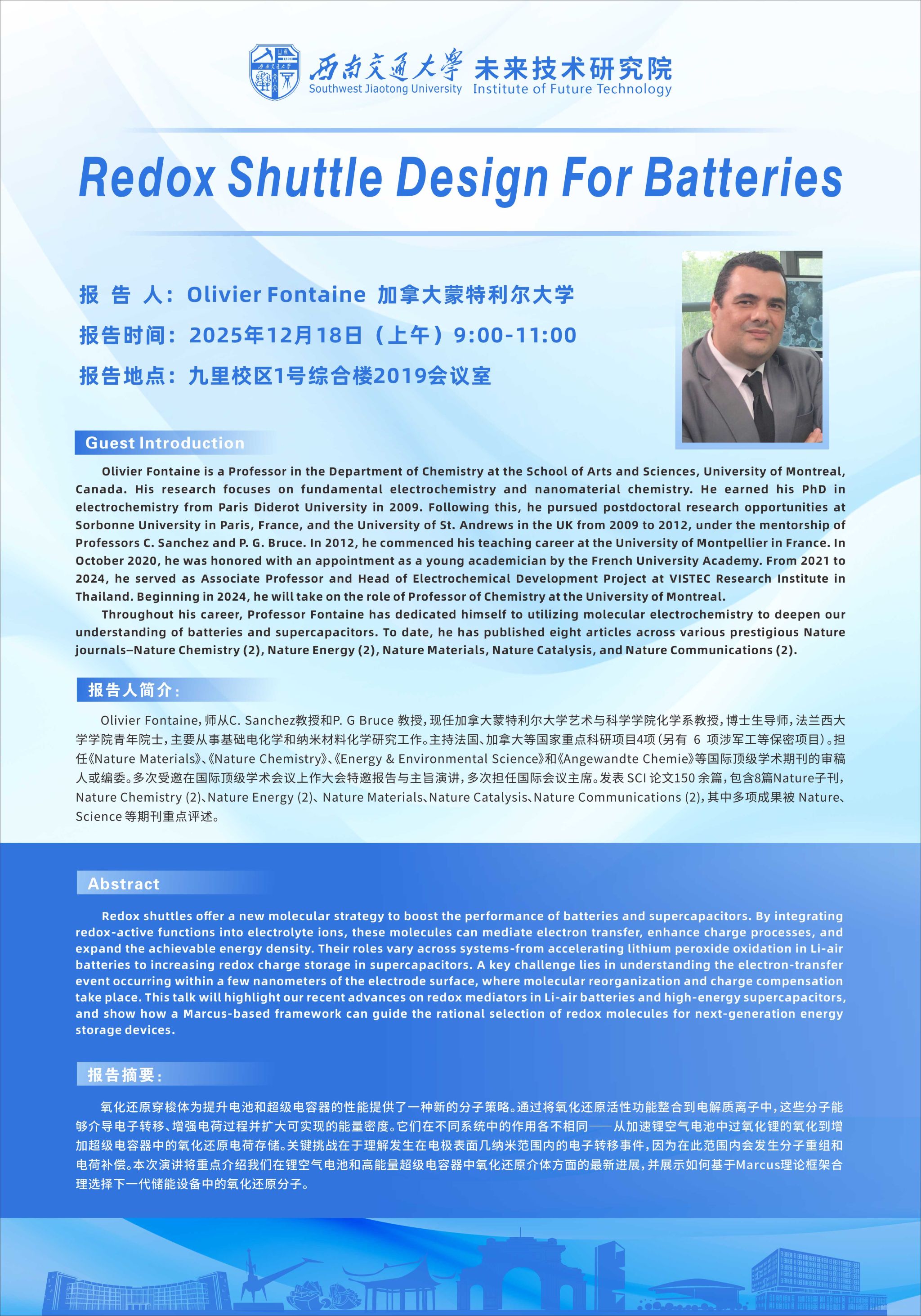 氧化还原穿梭体为提升电池和超级电容器的性能提供了一种新的分子策略。通过将氧化还原活性功能整合到电解质离子中,这些分子能够介导电子转移、增强电荷过程并扩大可实现的能量密度。它们在不同系统中的作用各不相同——从加速锂空气电池中过氧化锂的氧化到增加超级电容器中的氧化还原电荷存储。关键挑战在于理解发生在电极表面几纳米范围内的电子转移事件,因为在此范围内会发生分子重组和电荷补偿。本次演讲将重点介绍我们在锂空气电池和高能量超级电容器中氧化还原介体方面的最新进展,并展示如何基于Marcus理论框架合理选择下一代储能设备中的氧化还原分子。